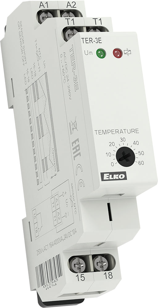 ELKO EPModuláris termosztát külső NTC hőmérséklet-érzékelő csatlakoztatással, 0 .. +60 °C tartományra, 1 °C fix hiszterézissel, 1x záró érintkező, AC/DC 2...