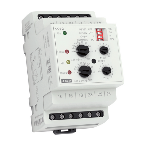 ELKO EPFelügyeleti relé 1- vagy 3- fázisú fogyasztók teljesítménytényező (cosφ) értékének figyelésére. Pl. villamos motorok, elsősorban szivattyúk túlterh...