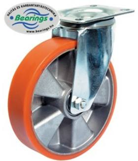 BSForgó villás szállítókerék. Horganyzott acéllemez villa, a forgórészben kétsoros görgősor. Keréktárcsa: alumínium öntvény. Futófelület: Öntött poli...