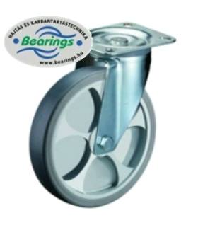 BSN100.B90.129(131. oldal) Talpas, forgóvillás, nagy teherbírású kerék. Cinkromátozott acéllemez villa. A villa forgórészében kettő darab golyósor bi...